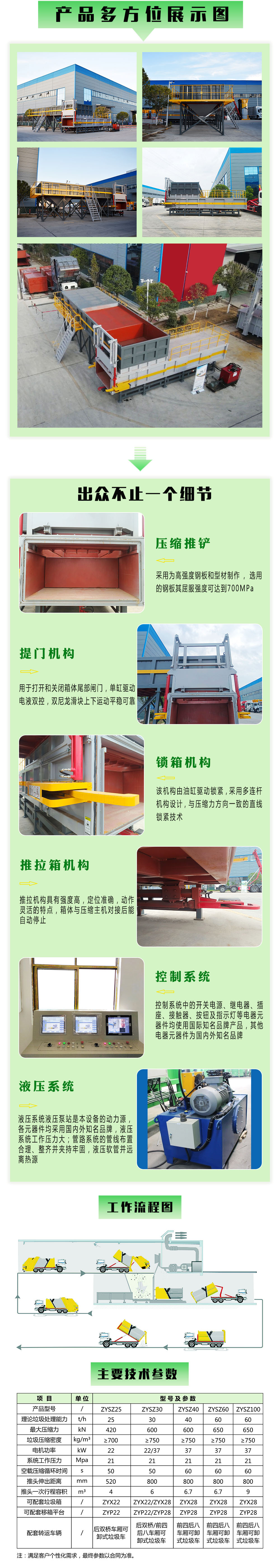中大型水平直压式垃圾压缩转运成套设备采用国际先进的水平直压式压缩工艺,具有综合性能优、适应性强、可“一机多箱、机箱分离”、车辆利用率高的特点,可根据垃圾处理高峰时段的要求合理配置单车位卸料槽、双车位推头式卸料槽;适应自卸垃圾车、小型垃圾压缩车以及垃圾转运车等多种垃圾收集方式的卸料需求,可采取简易配置或选装智能称重计量系统、交通指挥系统、除尘除臭系统、监控管理系统、车辆GPS系统,确保实现转运站投入小及整个系统运营成本低、垃圾处理效率高、环保无污染;适用于日处理150-1000t及以上的中、大型垃圾站。